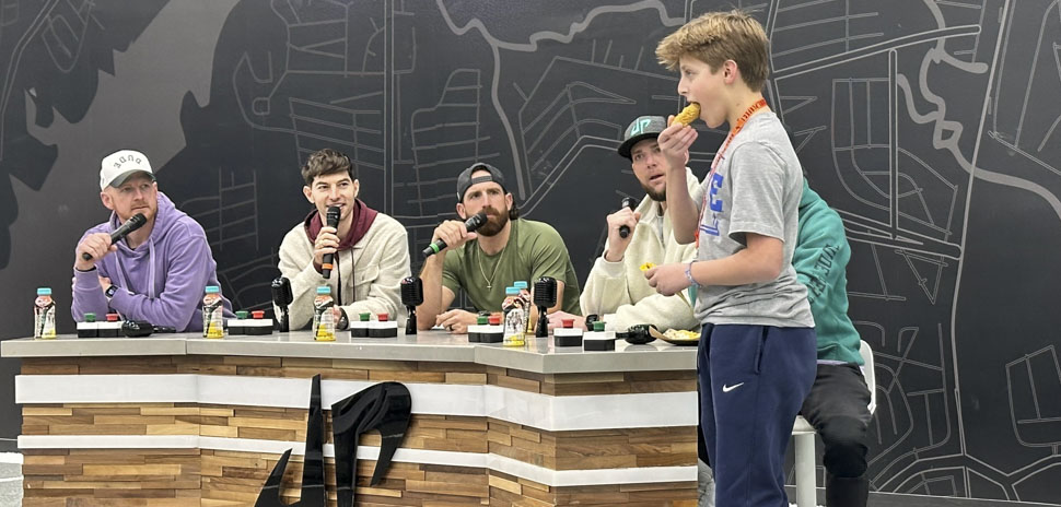 Dude Perfect tries bone-in ice cream at their new Frisco HQ. [Photo: Dallas Innovates]