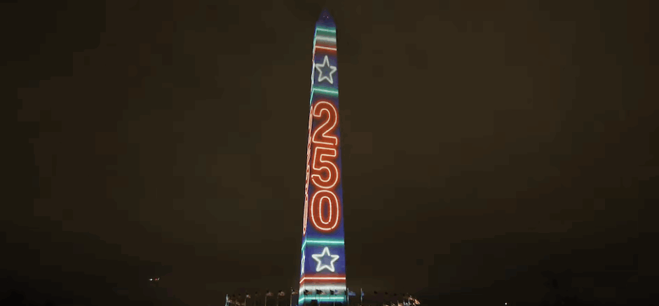 900lbs helped create the projection mapping display on the Washington Monument to celebrate America's 250th birthday year. [Video still: Freedom 250]