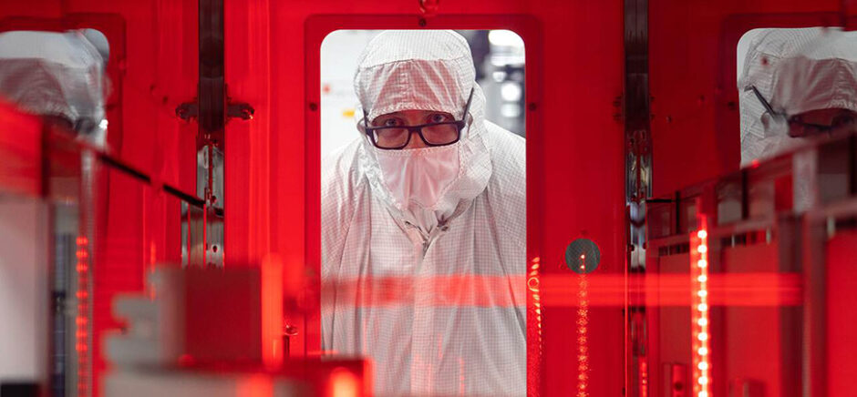 An employee monitors a wafer transfer at one of Texas Instruments’ 300mm semiconductor fabs in Sherman, Texas, SM1. [Photo: Texas Instruments]