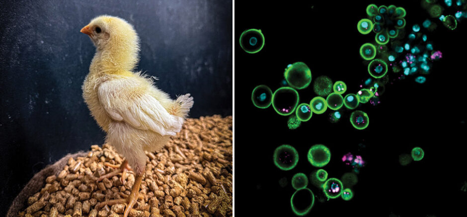Left: Colossal’s gene-edited chickens carrying edited PGCs; Right: Colossal Pigeon Primordial Germ Cells [Photos: Colossal]