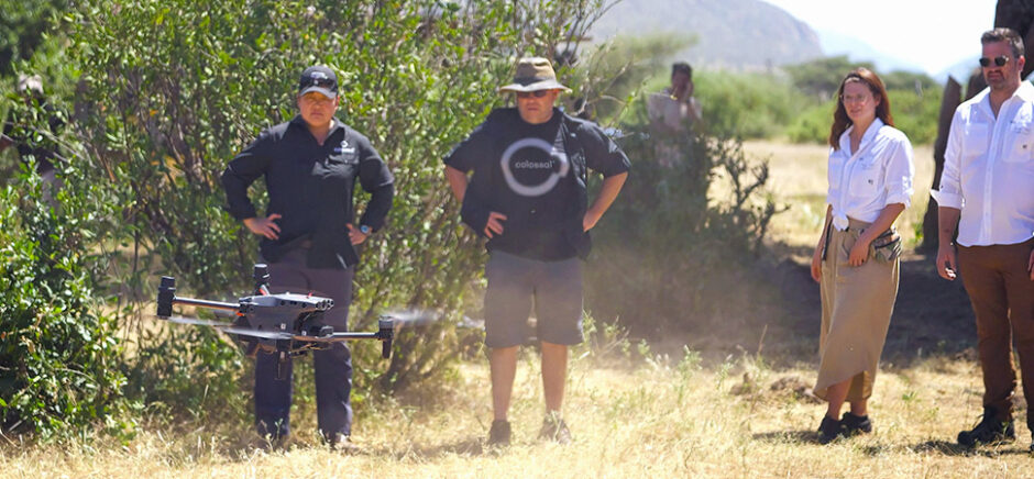Left to right: Wendy Kiso, Principal Scientist, Assisted Reproduction; Steve Metzler, Head of Animal Husbandry; Leah Brickson, Manager of AI and Machine Learning and Matt James, Chief Animal Officer pictured using a drone in Kenya. [Photo: Colossal Biosciences]